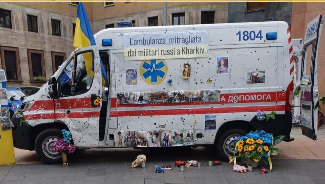 A Cernusco l’ambulanza ucraina crivellata di colpi dai russi a Kharkiv